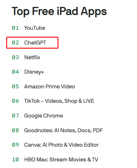 在iPad端,YouTube位居免费应用榜首,ChatGPT紧随其后排名第二,Netflix、Disney+和亚马逊Prime Video分列三至五位。这表明ChatGPT不仅在手机端,在平板设备上同样获得用户青睐。