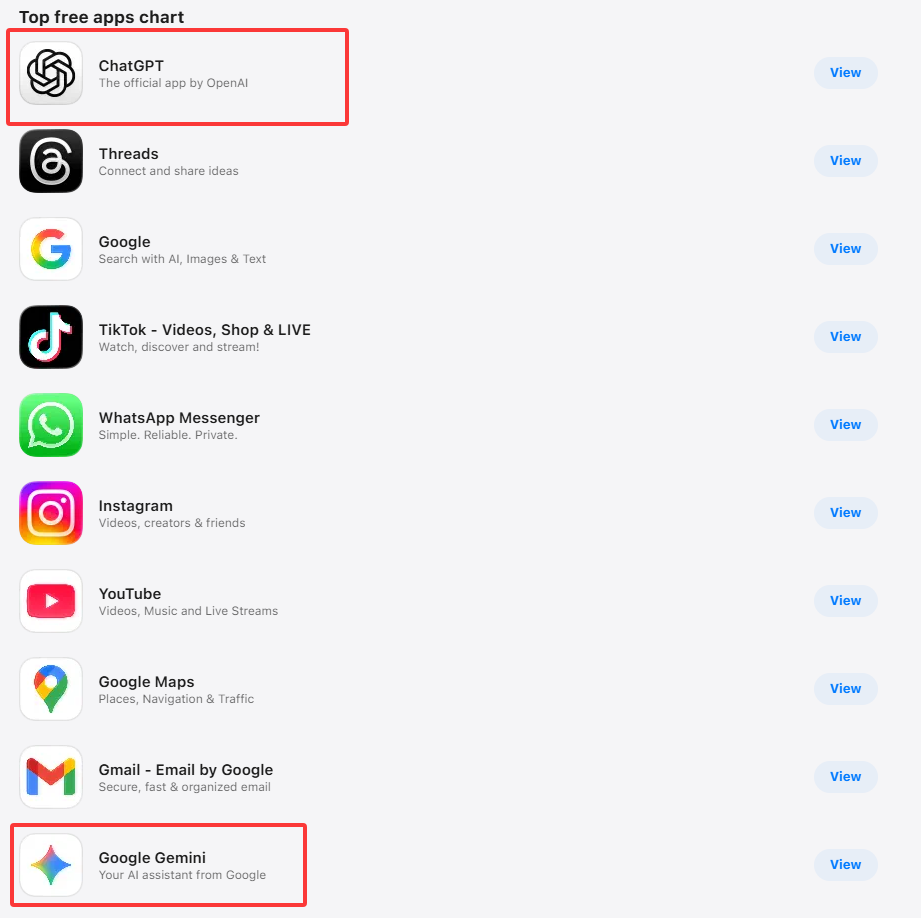 周三,苹果发布的年度应用和游戏下载榜单显示,ChatGPT位居美国iPhone免费应用榜首,谷歌的Gemini则位居第十。